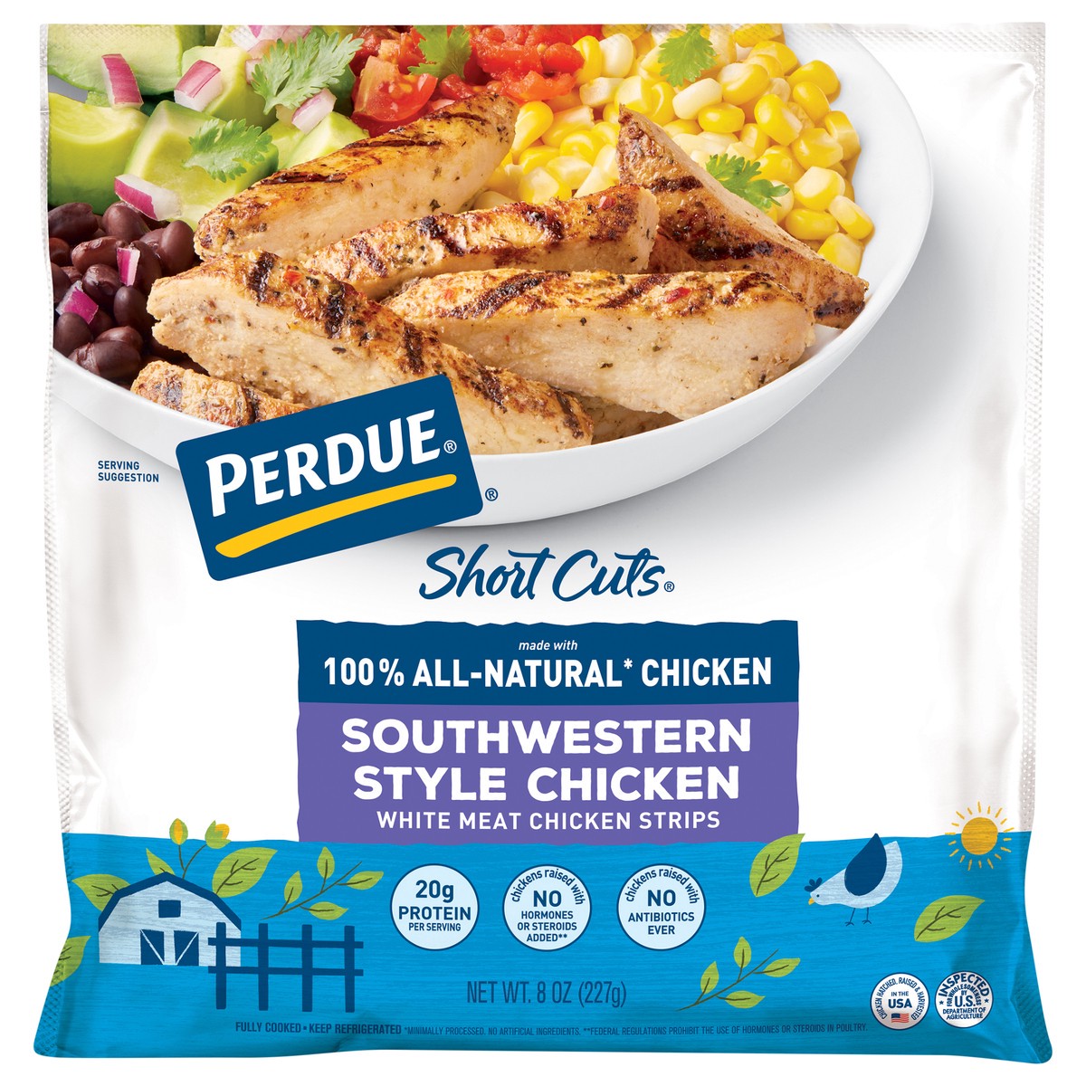 PERDUE SHORT CUTS Southwestern Style Chicken Strips are fully cooked chicken strips with a bold burst of flavor. Seasoned with a blend of cilantro, bell pepper, onion, and jalapeno, these chicken stri…