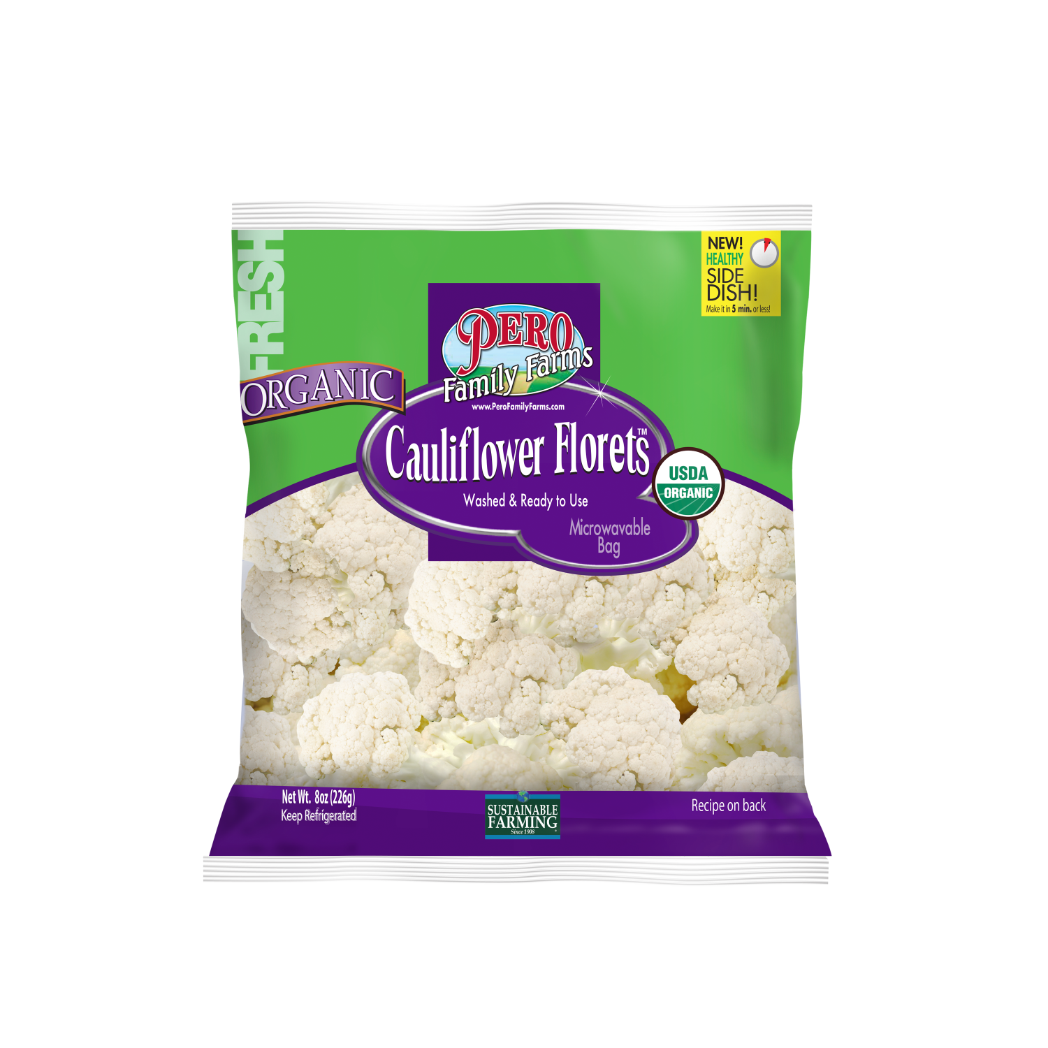 USDA Organic. Certified Organic by CCOF. New! Healthy side dish! Make it in 5 min. or less. Washed & ready to use. Microwavable bag. Lemon garlic cauliflower. Make this recipe with Pero organic caulif…
