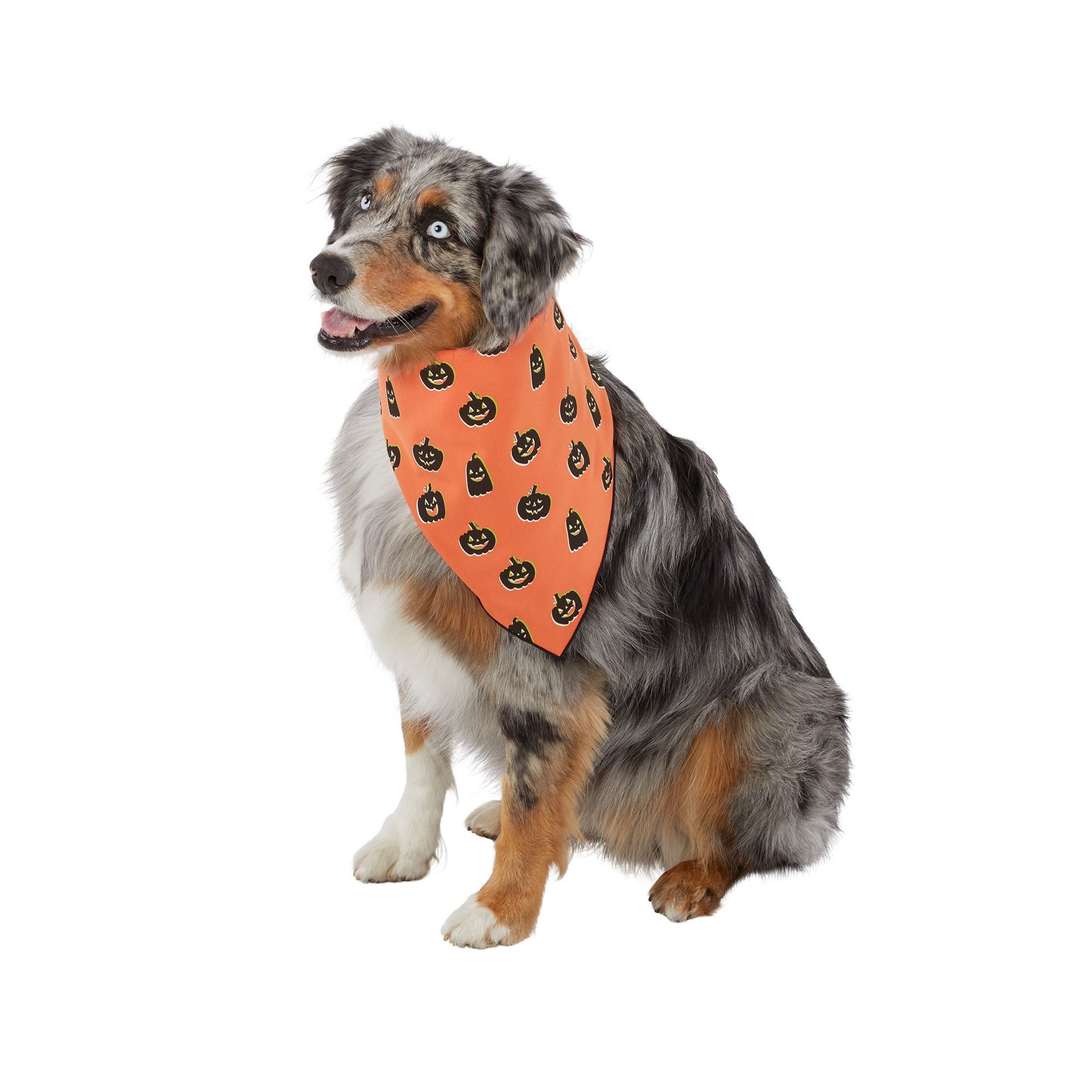 slide 1 of 1, Pet Halloween Thrills & Chills Halloween Glow in the Dark Pumpkin & Moon Print Reversible Dog Bandana, LG/XL