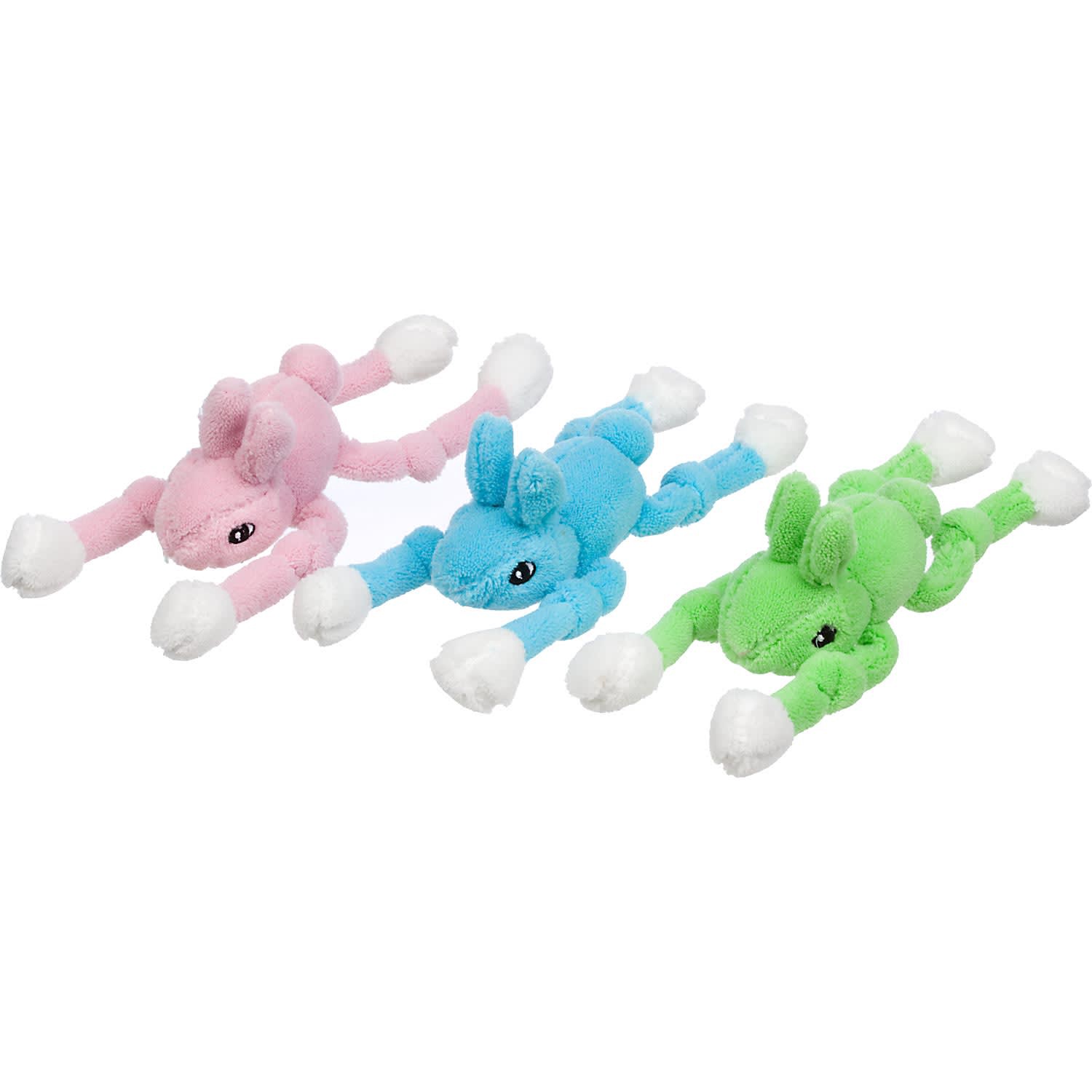 MiniL X 2.25H X 2.25W. Super soft plush toy with extra long legs for flopping around. Includes a squeaker for additional interest. Great for playing tug or toss too. Made of nontoxic petsafe materials…