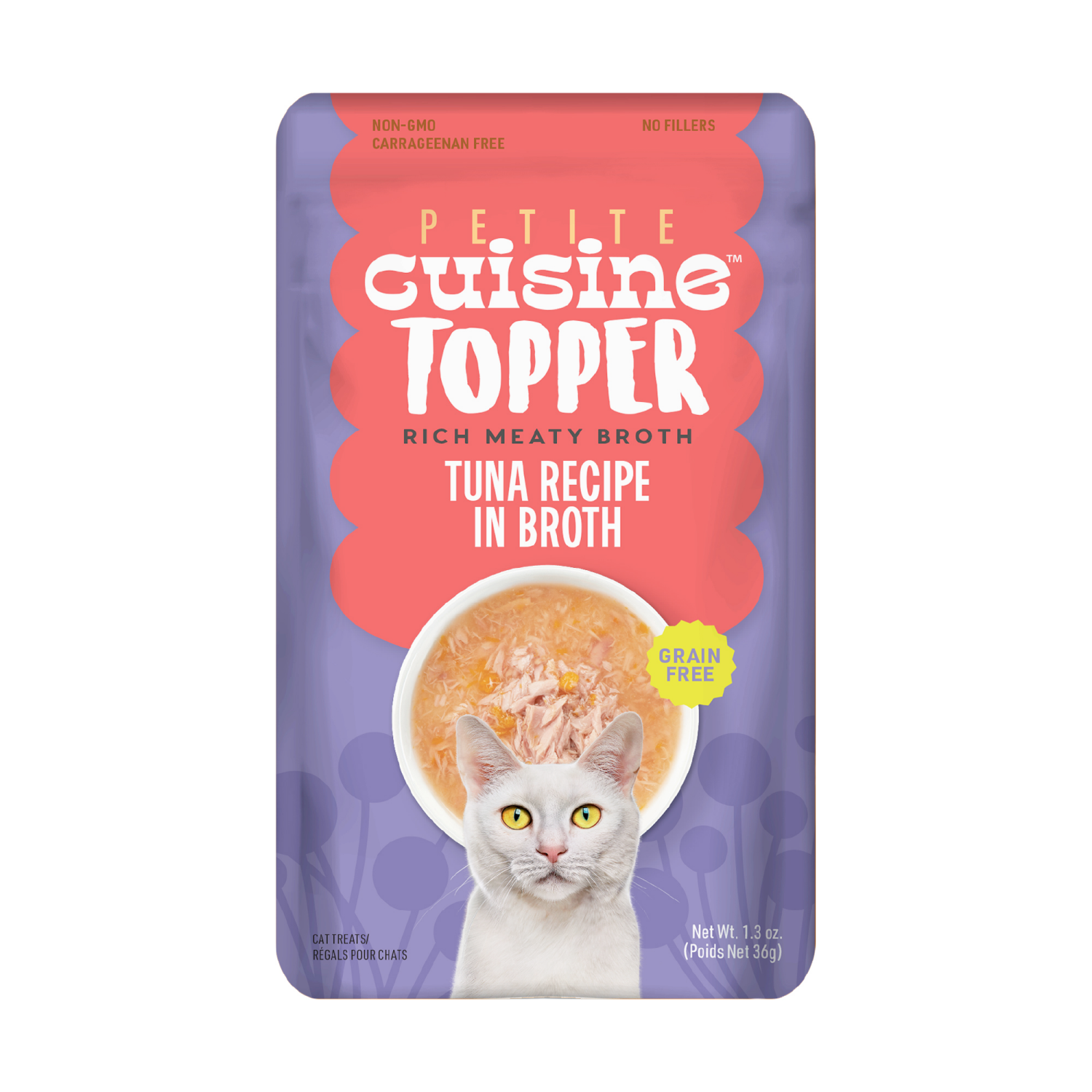Calorie Content (Calculated): 280 kcal ME/kg. 10 kcal ME/pouch. Petite Cuisine Consomme Tuna Recipe in Broth wet treats are intended for intermittent or supplemental feeding only.