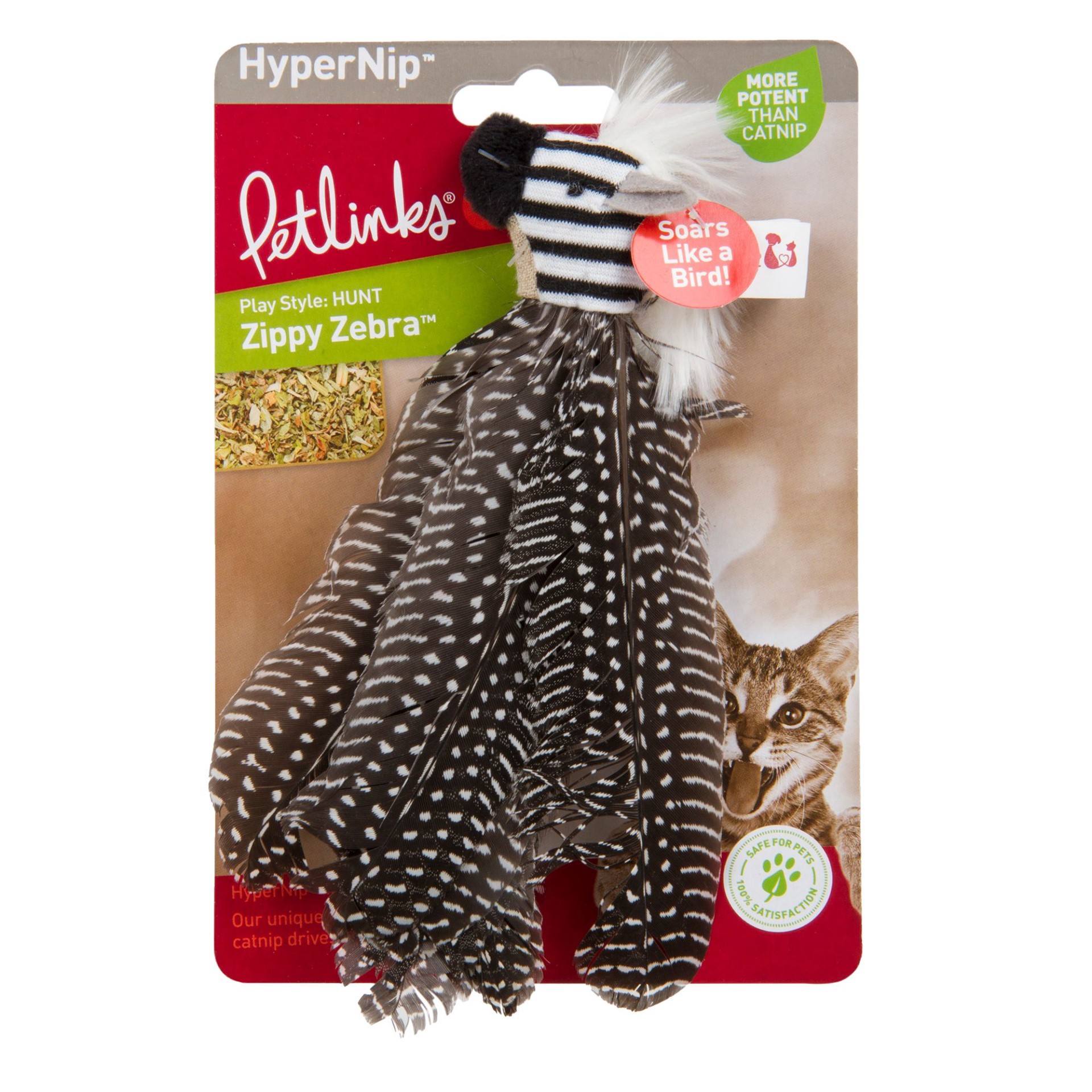 Petlinks Zippy Zebra a Catnip and Silvervine toss and chase feather toy with a new patented play solution replicates the motion of a badminton birdy with extra-long feathers and faux fur that cats can…