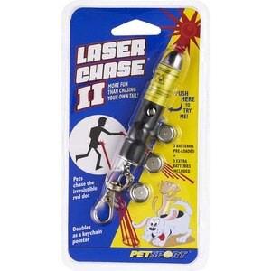 PETSPORT USA MORE FUN THAN CHASING YOUR OWN TAIL! PUSH HERE TO TRY ME! Batteries Pre-Loaded 3 Extra Batteries Included Pets chase the irresistible red dot Doubles as a keychain pointer FDA CE Laser Ra…