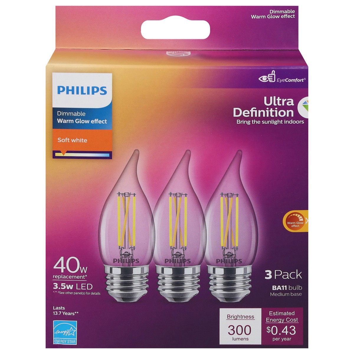 Philips 3.5 Watts Ultra Definition Soft White Warm Glow Effect LED Light Bulbs 3 ea