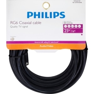 Quality TV signal. Universal for all brands. TV. DVD. Modem. CBL. Sat. 25 ft. 25 ft. 7.6 m. Function: Connects video components together. RG6 provides the best connection for transmitting cable TV sig…
