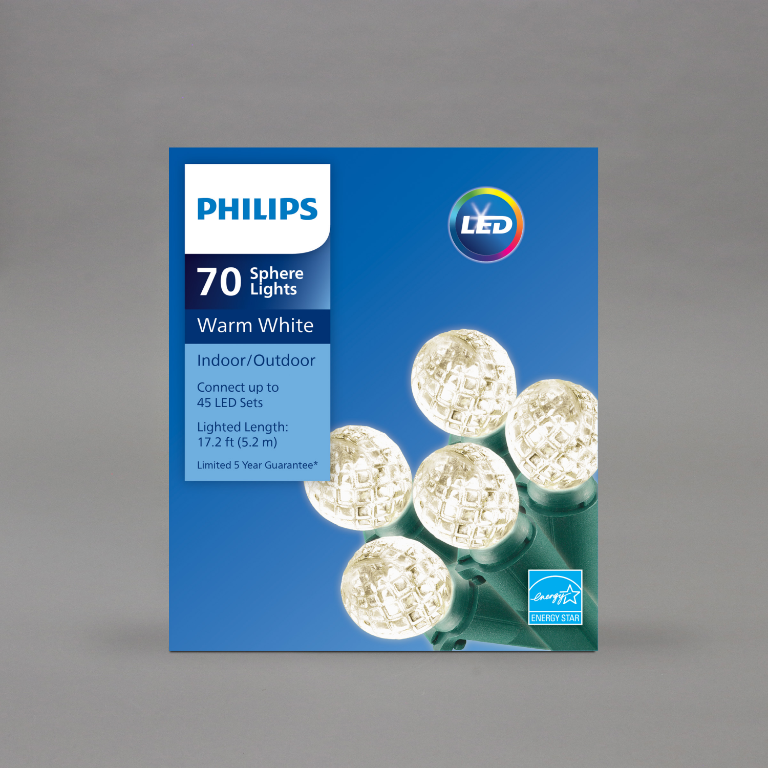 Decorate a variety of areas in and around your home with this Philips 70LT LED faceted sphere warm white light set. You are able to connect up to 30 LED sets. A set of LED lights costs only a fraction…