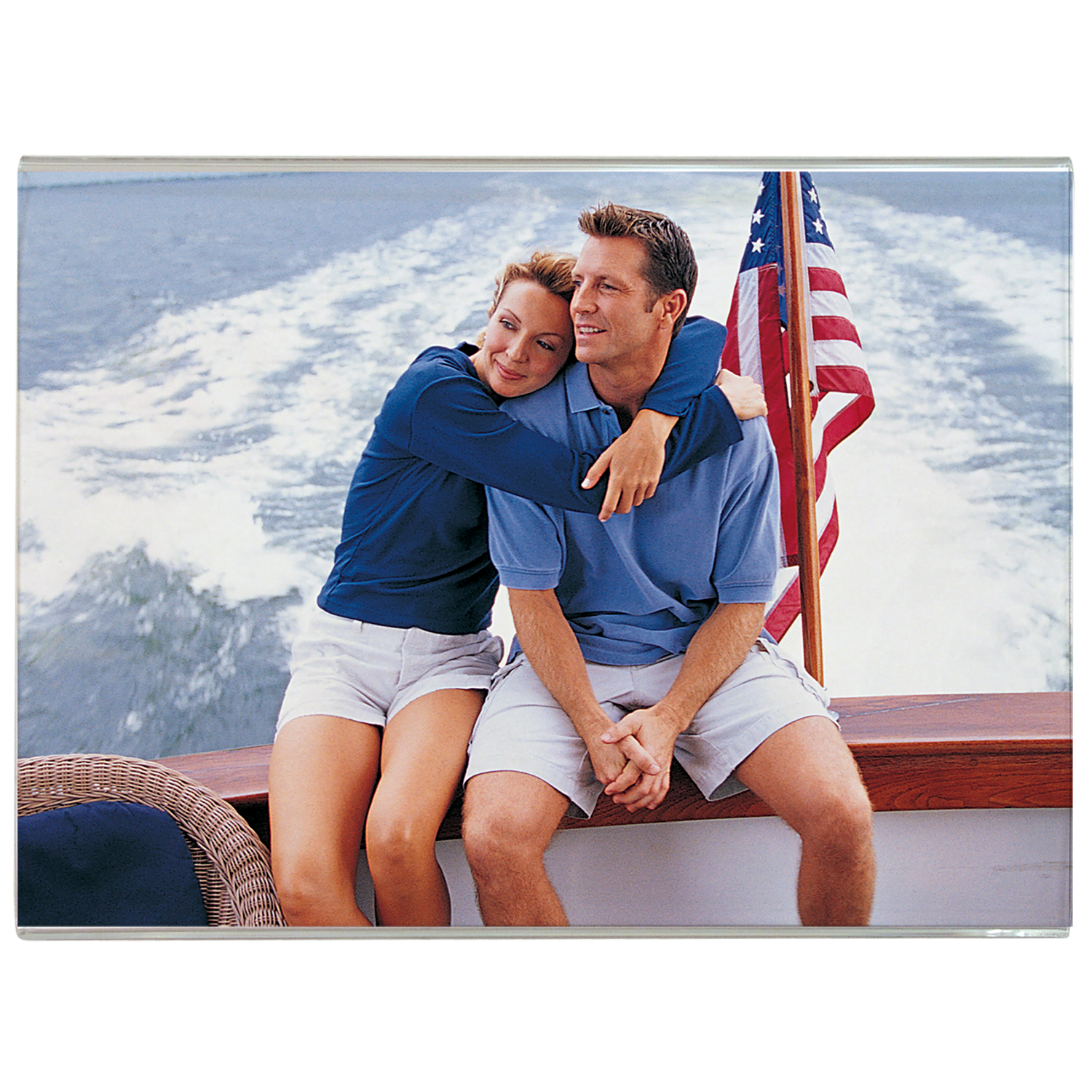 Malden 7x5 inch Horizontal Bent Clear Acrylic Photo Frame clear color. The frame is constructed from a single piece of acrylic. The frame holds a 7x5" photo. Simple to load photo through the opening i…