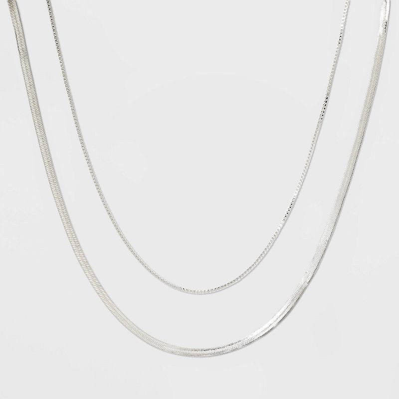 Whether you're looking to create a simple look or an eye-catching look, this 2-Piece Plated Herringbone and Box Chain Necklace Set from A New Day™ will meet all your styling needs. This silver-tone ne…