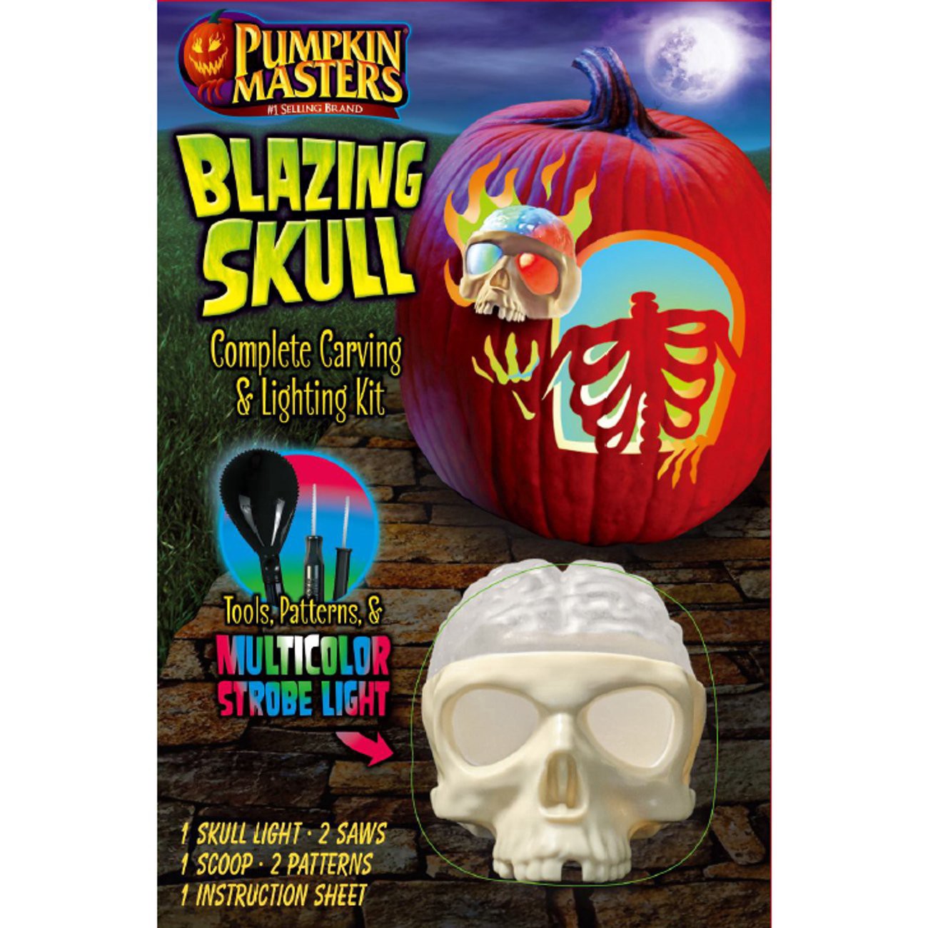 Pumpkin Masters® Blazing Skull Complete Carving & Lighting Kit features a new technique of lighting both the inside and outside of the pumpkin, creating a cool 3D effect.New technique for pumpkin carv…