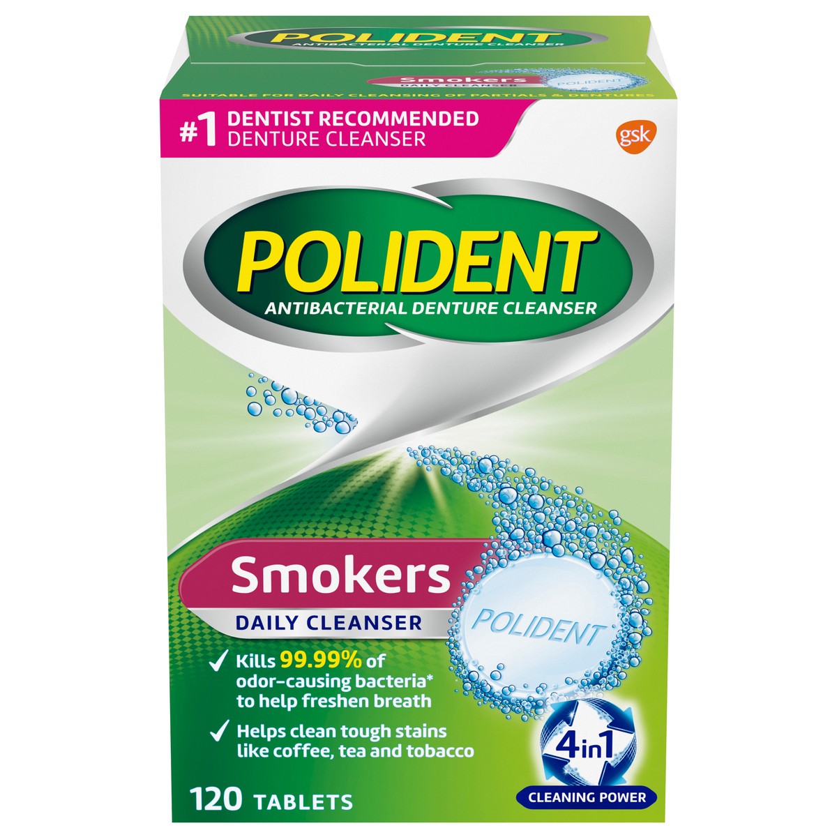 A deep, fresh denture clean has never been easier! Polident Smokers Denture kills 99.99% of odor-causing bacteria (1) and viruses (2) and deep cleans to help remove stubborn tobacco stains from dentur…