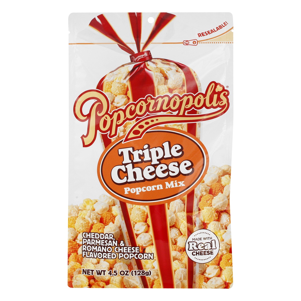 Cheddar parmesan & romano cheese flavored popcorn. Certified gluten free. GFCO.org. Whole Grain: 13 g or more per serving. Eat 48 g or more of whole grains daily. WholeGrainsCouncil.org. Made with rea…