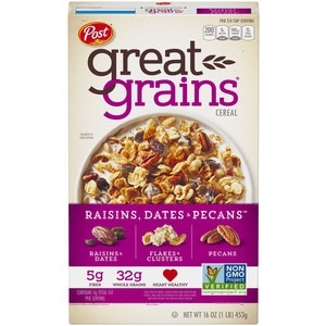 Post Great Grains Cereal is a delicious way to start off your day. It features naturally sweetened raisins dates. Great Grains whole grain cereal contains several hearthealthy ingredients, making it …