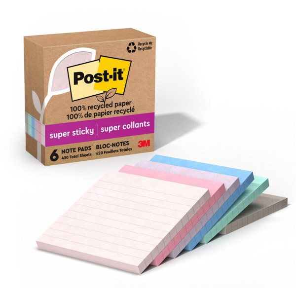 Post-It Paper Super Sticky Notes, 420 Total Notes, Pack Of 6 Pads, 4"" X 4"", 100% Recycled, Wanderlust Pastels, 70 Sheets Per Pad