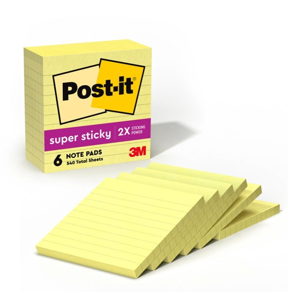 Post-it Super Sticky Notes, 4'' X 4'', Canary Yellow, Lined, Pack Of 6 Pads