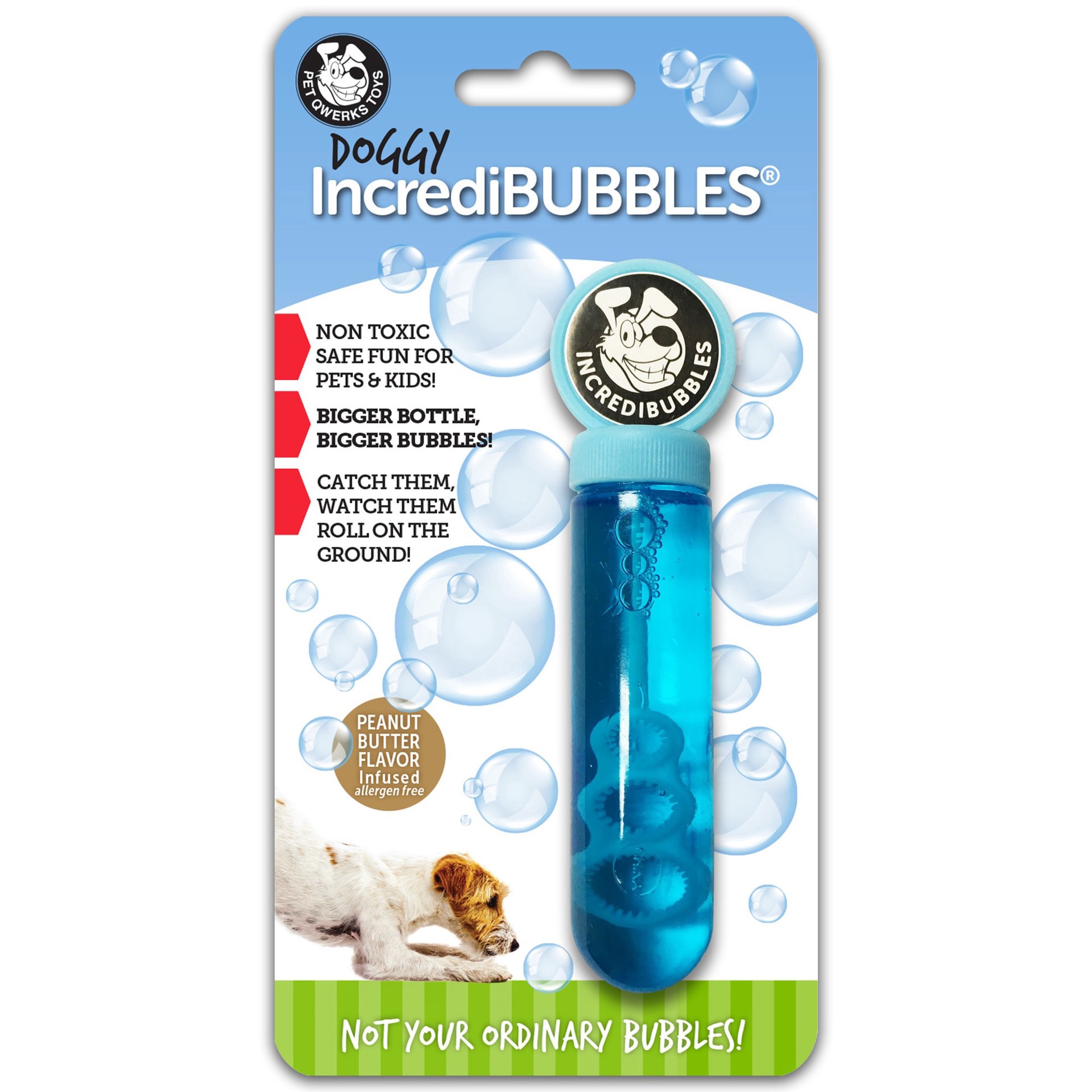 Fun for pets and people! Bubbles dry in the air and land intact. Infused with a non-allergen peanut butter flavor. Safe, non-toxic non-stai product.