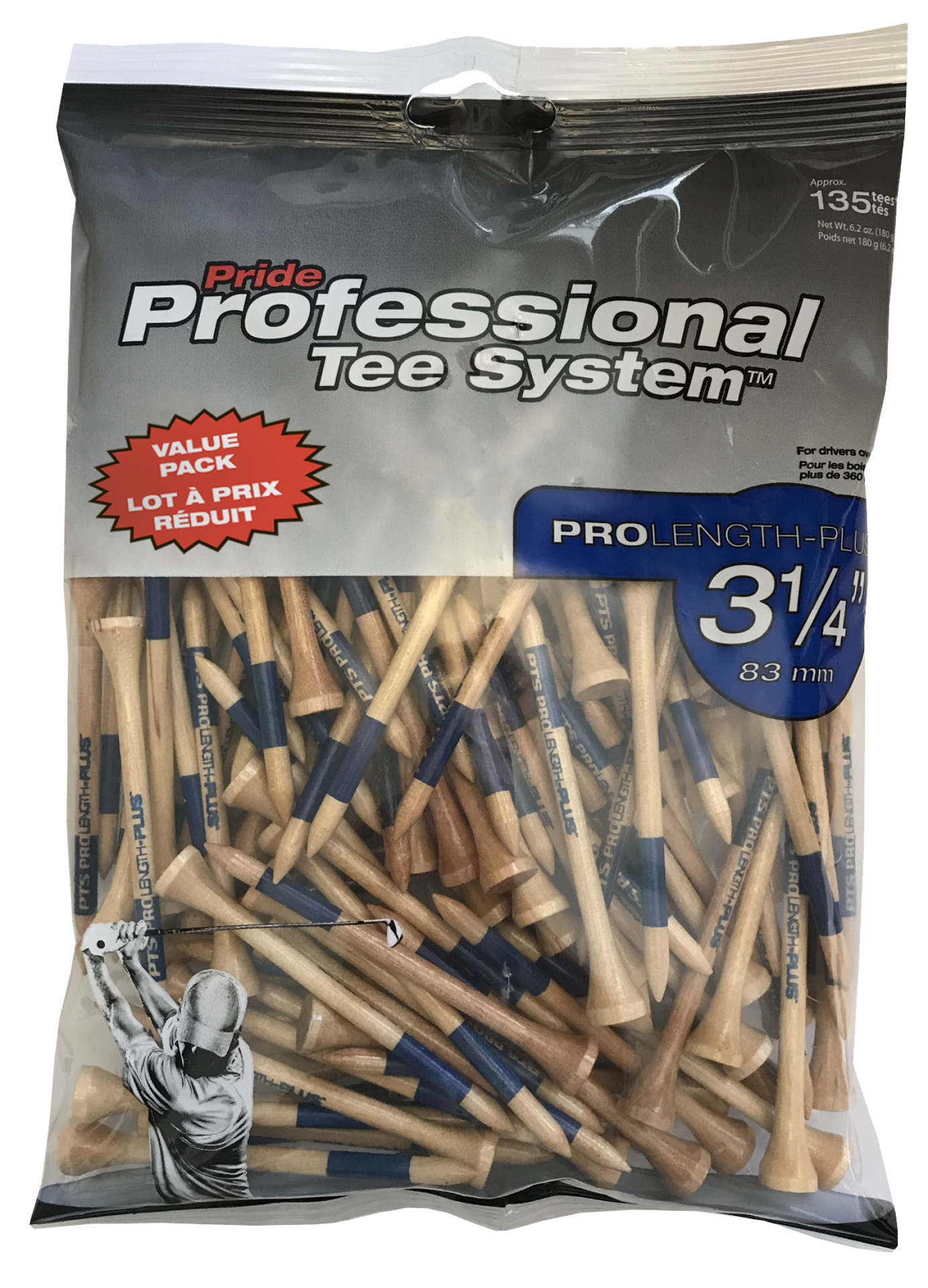PRIDE PROFESSIONAL TEE SYSTEM (PTS); Color bar indicates tee length for easy identification and appropriatness for various golf clubs. 135 COUNT, 3-1/4" PROLENGTH PLUS; Perfect for drivers over 360CC …