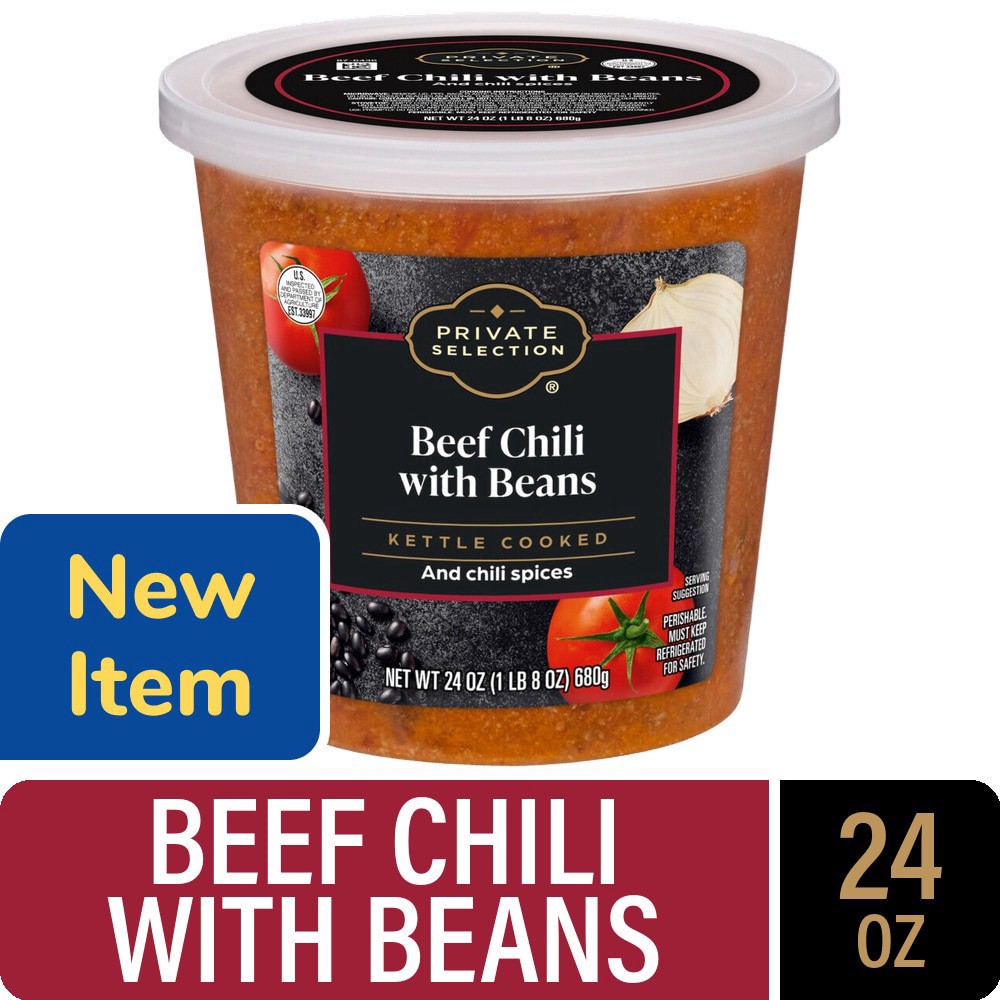 Private Selection® Kettle Cooked Beef Chili with Beans blends ground beef, juicy tomatoes, and kidney and black beans into a delectable journey of taste. Chili spices entice the palette while onions e…