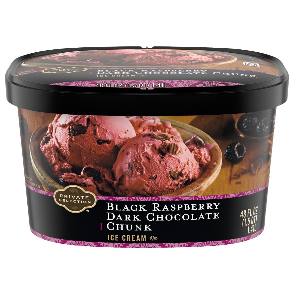 Our private selection black raspberry dark chocolate chunk ice cream has pieces of dark chocolate folded into a sweet creamy black raspberry ice cream for a truly divine indulgence