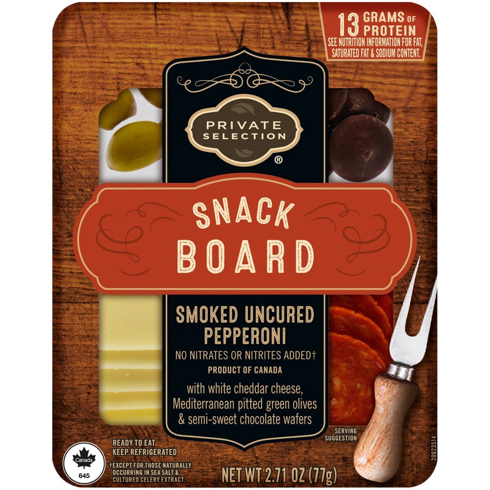 Smoked Uncured Pepperoni. No nitrates or nitrites added (Except for those naturally occurring in sea salt & cultured celery extract), White cheddar cheese. Moroccan pitted green olives. Semi-sweet cho…