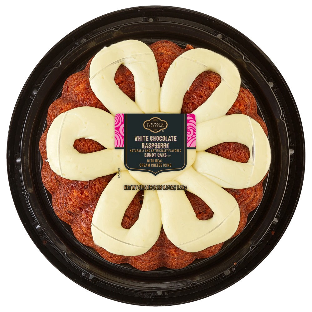 Private Selection® White Chocolate Raspberry Bundt Cake with Cream Cheese Icing indulges your taste buds with the harmonious blend of sweet white chocolate chips and tart raspberry preserves. Each sli…