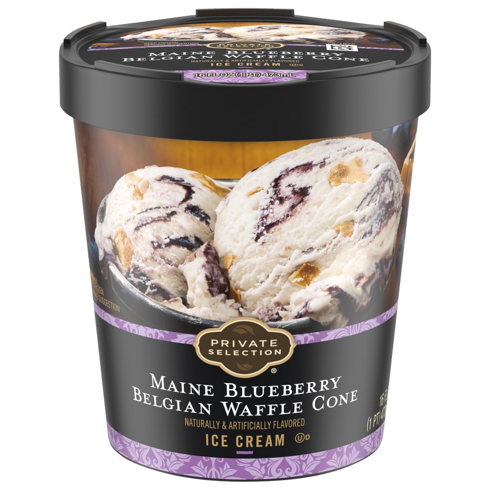Premium ice cream with a blueberry ripple and belgian style waffle cone pieces for a truly divine indulgence