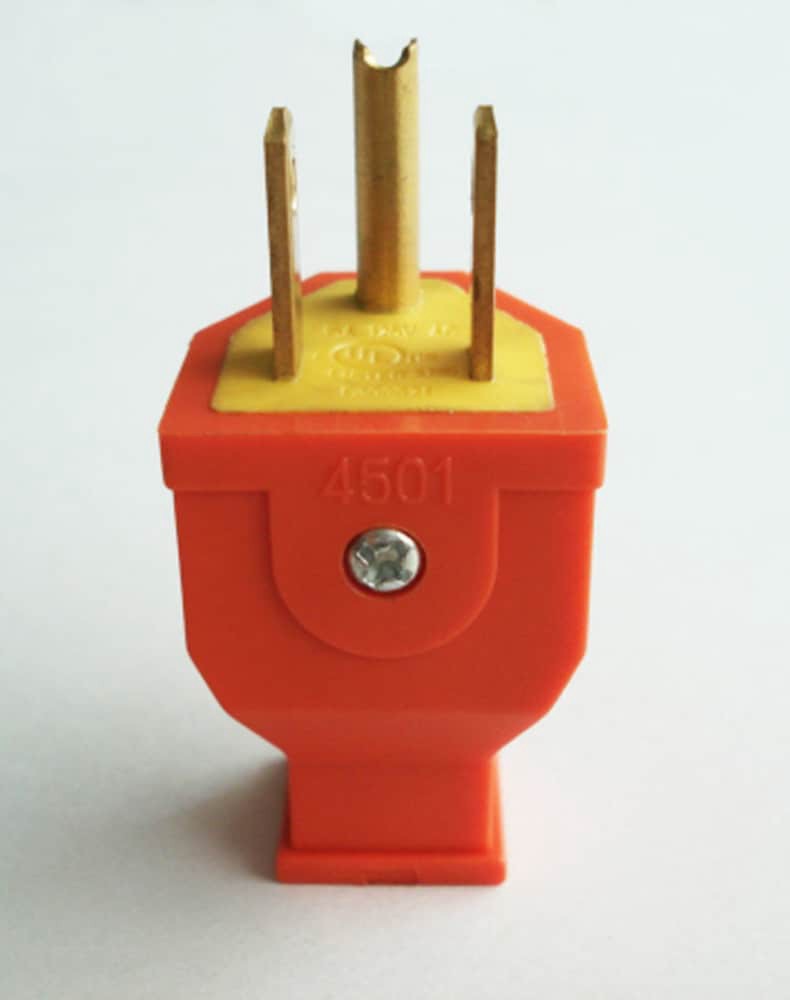 A 15 Amp 3-prong straight plug. A 2-pole 3-wire grounding plug. The color is orange.