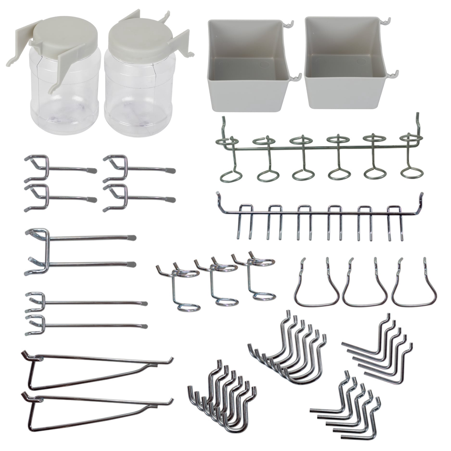 Works in both 1/4-in and 1/8-in pegboard. Contains peg hooks, holders, storage bins and peg locks. 2 lb maximum weight capacity. Zinc-plated. Steel construction. Use in garage, basement, shed, worksho…