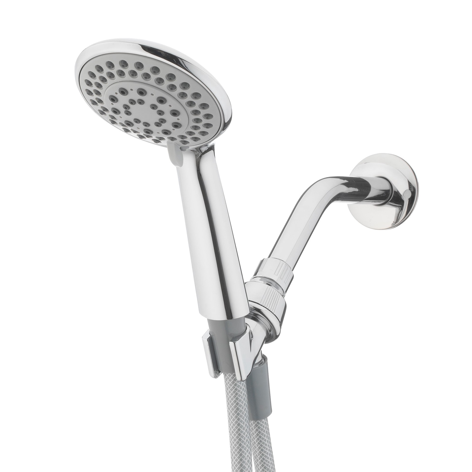 Chrome Project Source handheld shower head. Self cleaning rubber nozzles reduce clogging. 5-Spray settings provide a variety of water flow options to suit your preferences. Includes 5 spray settings. …