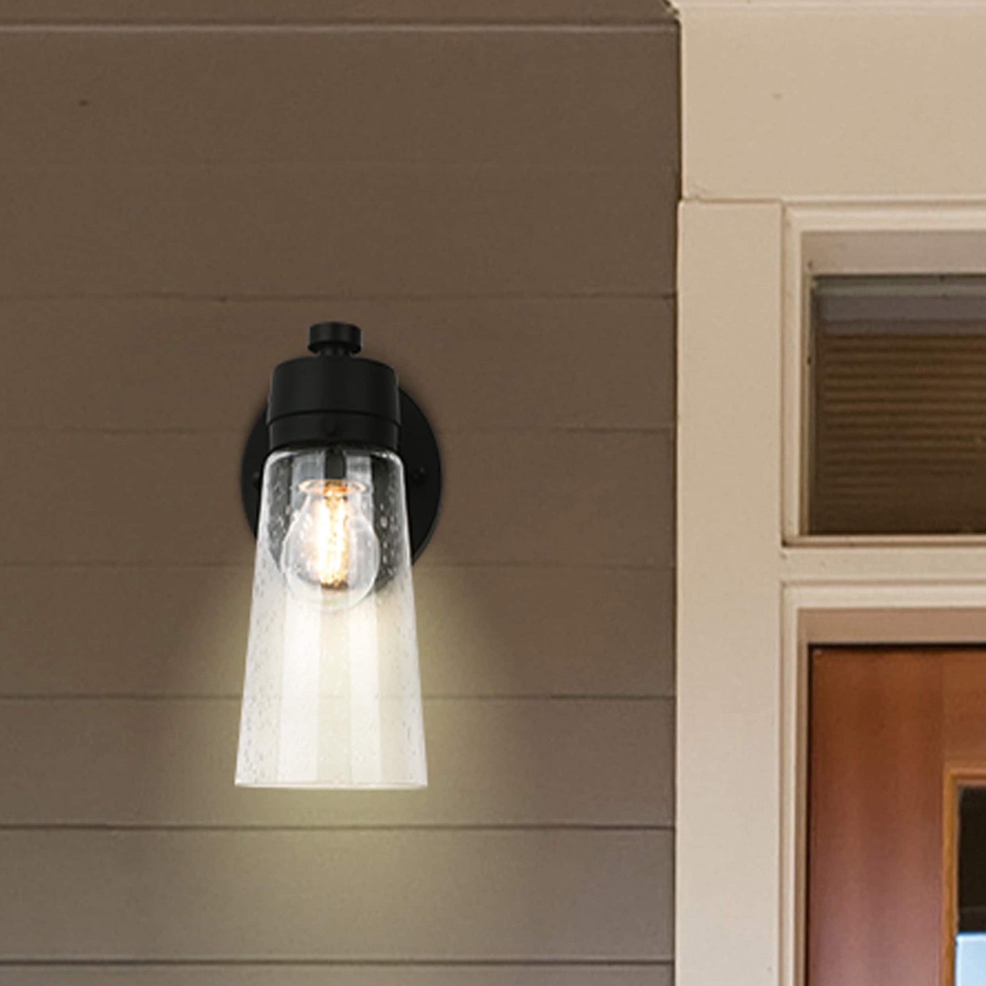 This outdoor wall lights comes with matte black finish and clear seeded glass. Fixture dimensions: 4.5-in W x 5.375-in D x 9-in H. One 60-watt medium base A19 bulbs required(sold separately). Wet loca…