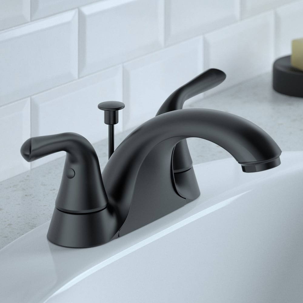 Project Source Dover Matte Black 4-in centerset 2-handle WaterSense Mid-arc Residential Handle Bathroom Sink Faucet with Drain with Deck Plate