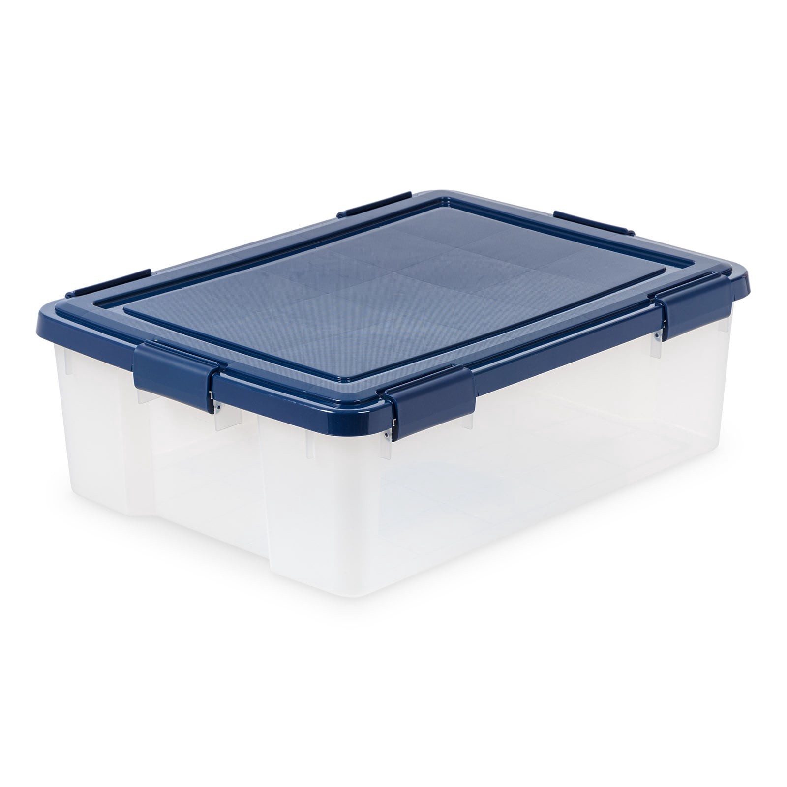 Waterproof storage seal on storage tote is the ideal way to keep stored contents clean and dry. Blue lid provides stability for stackable plastic storage bins. Clear body for quick visibility of stora…