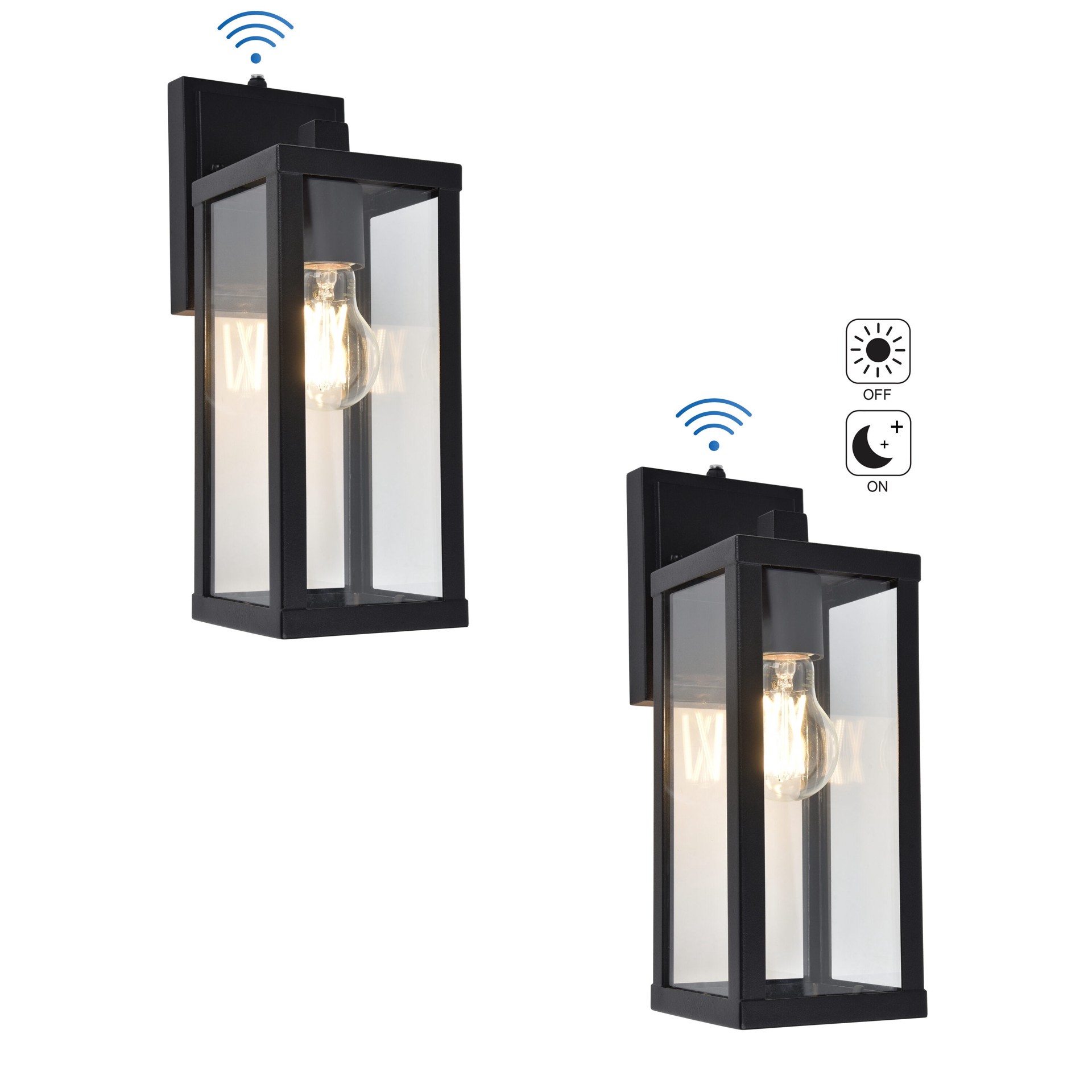 Set of two outdoor wall lights. Integrated dusk to dawn photocell sensor turns light on at dusk and off at dawn for convenience and energy savings. Weather-resistant matte black aluminum frame with cl…