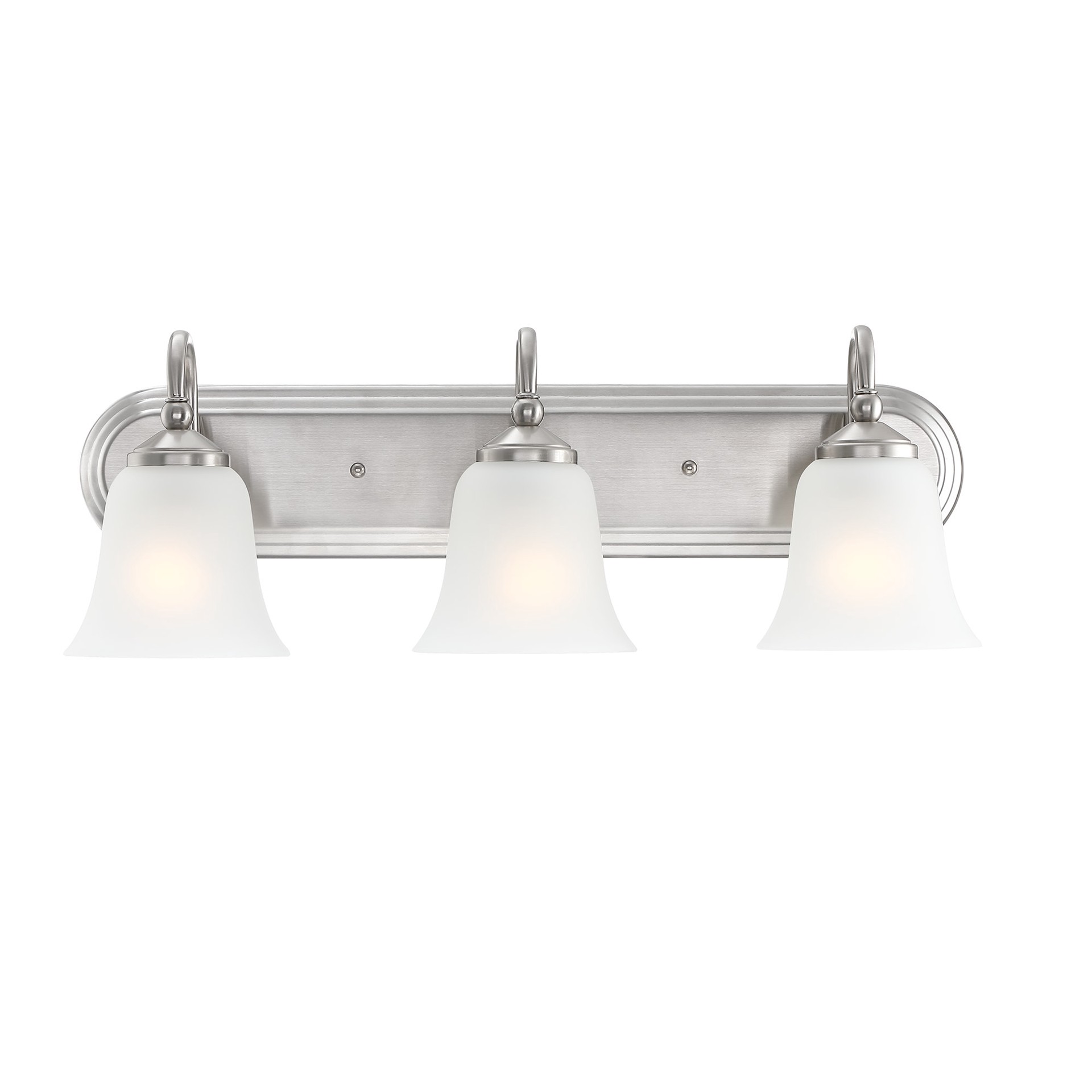3 light vanity bar. Brushed nickel finish with frosted glass shades. Three 60-watt medium base bulb required (not included).