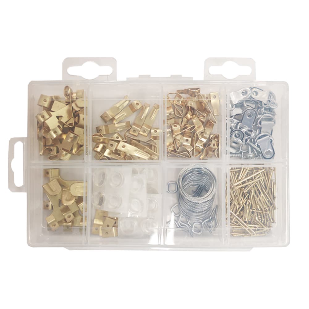 Kit contains all the hardware needed to hang a variety of pictures. Holds pictures from 10lbs to a maximum of 75lbs. Includes 291 pieces. Hardware is made of steel with a brass color finishh. Stores e…