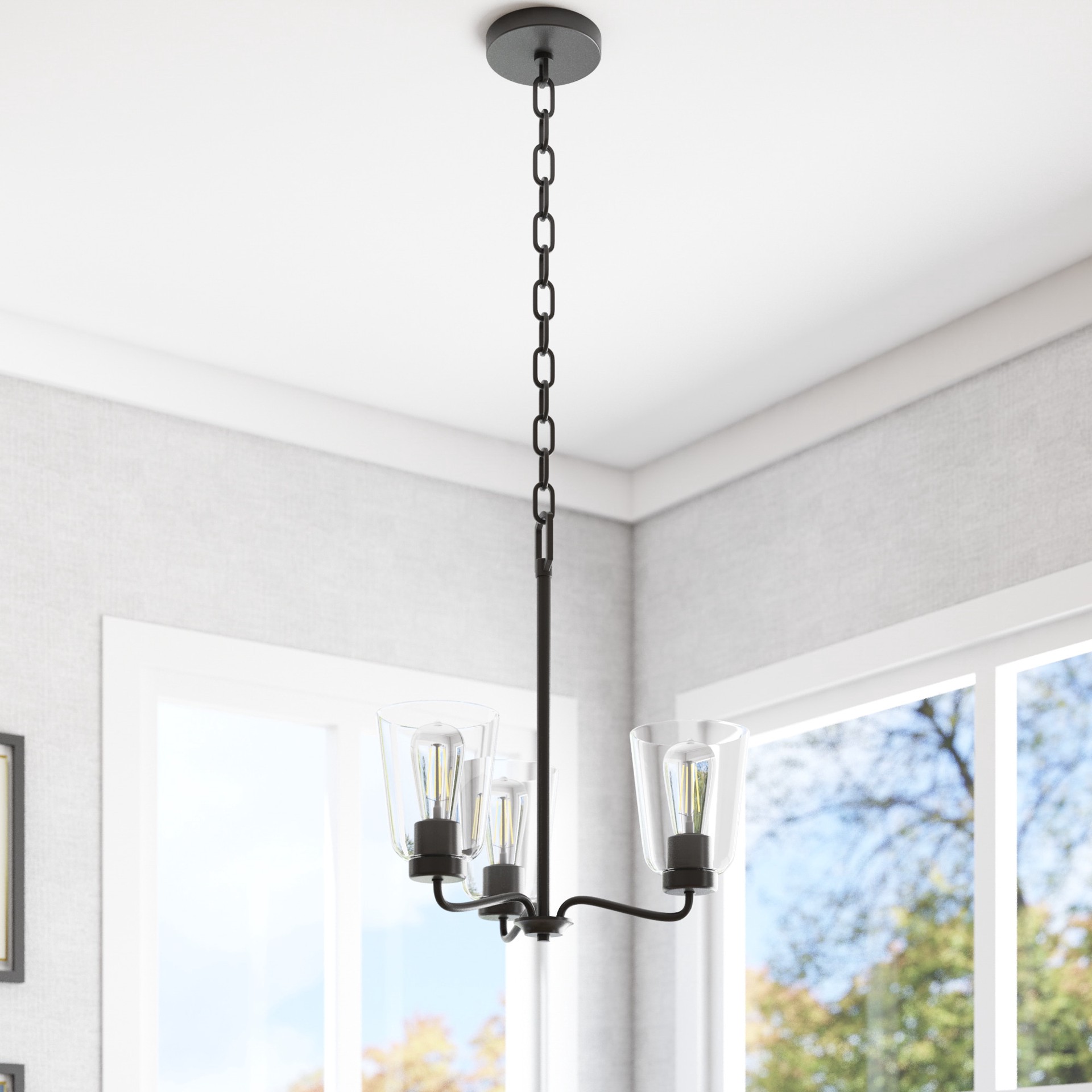 Hardwire chandelier mounts to flat ceilings with adjustable chain. Uses 3 x E26, 60-watt max bulbs (sold separately). Popular matte black finish complements a variety of interiors. Clear glass adds a …