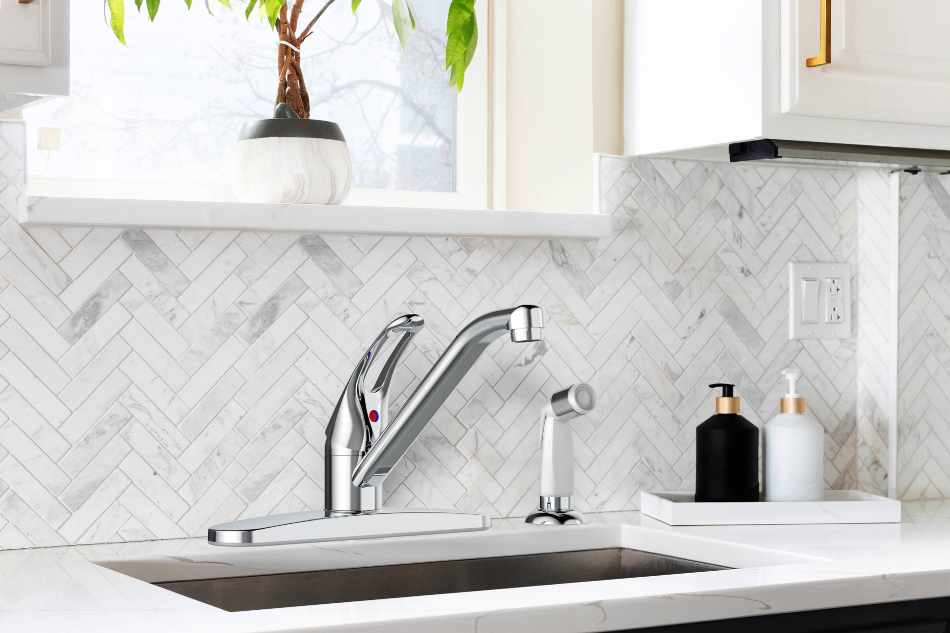 Chrome finish kitchen faucet from Project Source adds shine to your space. Lever handle is easy to use. Limited Lifetime Warranty. Side spray included for convenient cleaning at the kitchen sink. 1.8 …