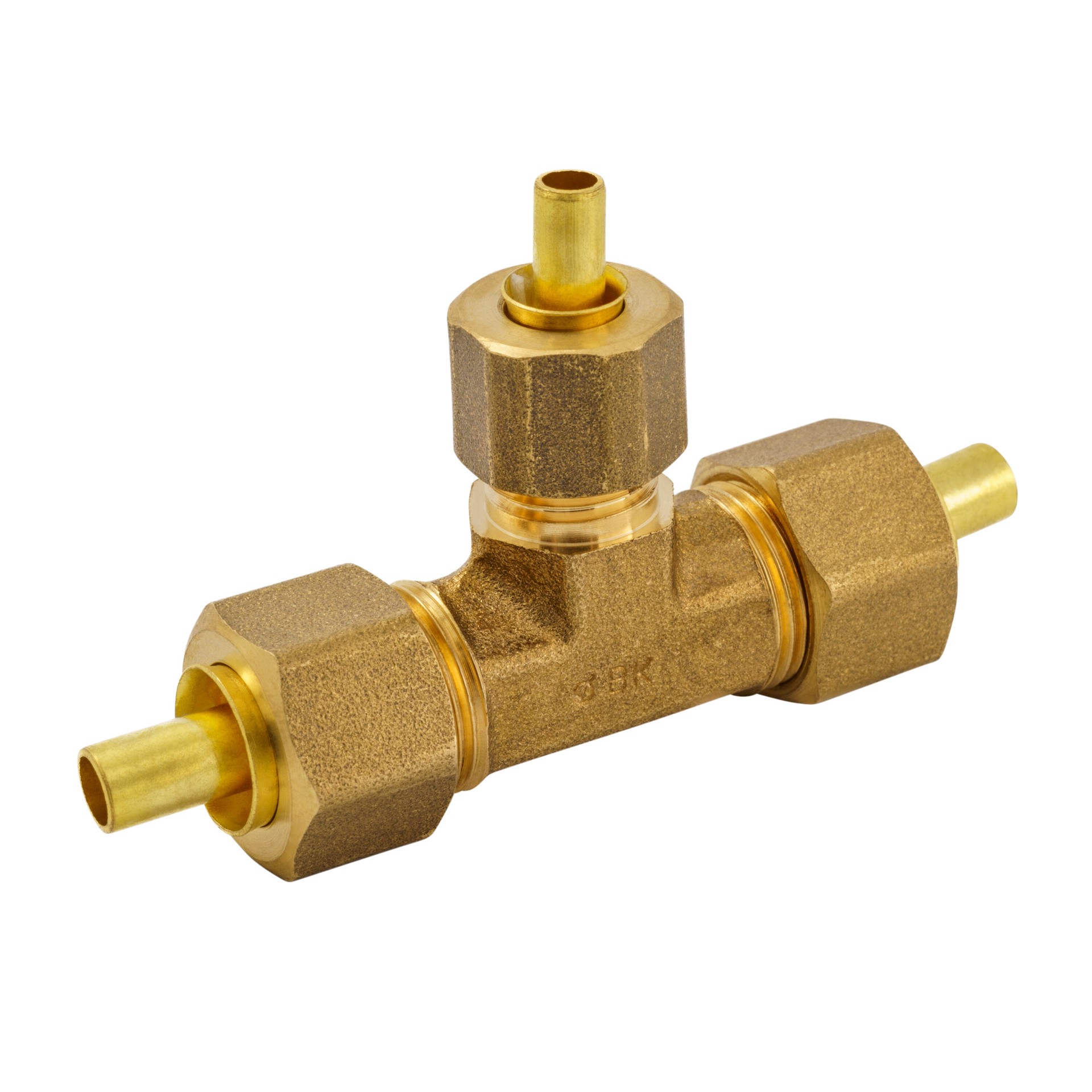Provides a method to connect three separate lines. Constructed of durable, lead-free brass. Brass is corrosion-resistant and can be used indoors and outdoors. Ferrules are included to compress onto th…