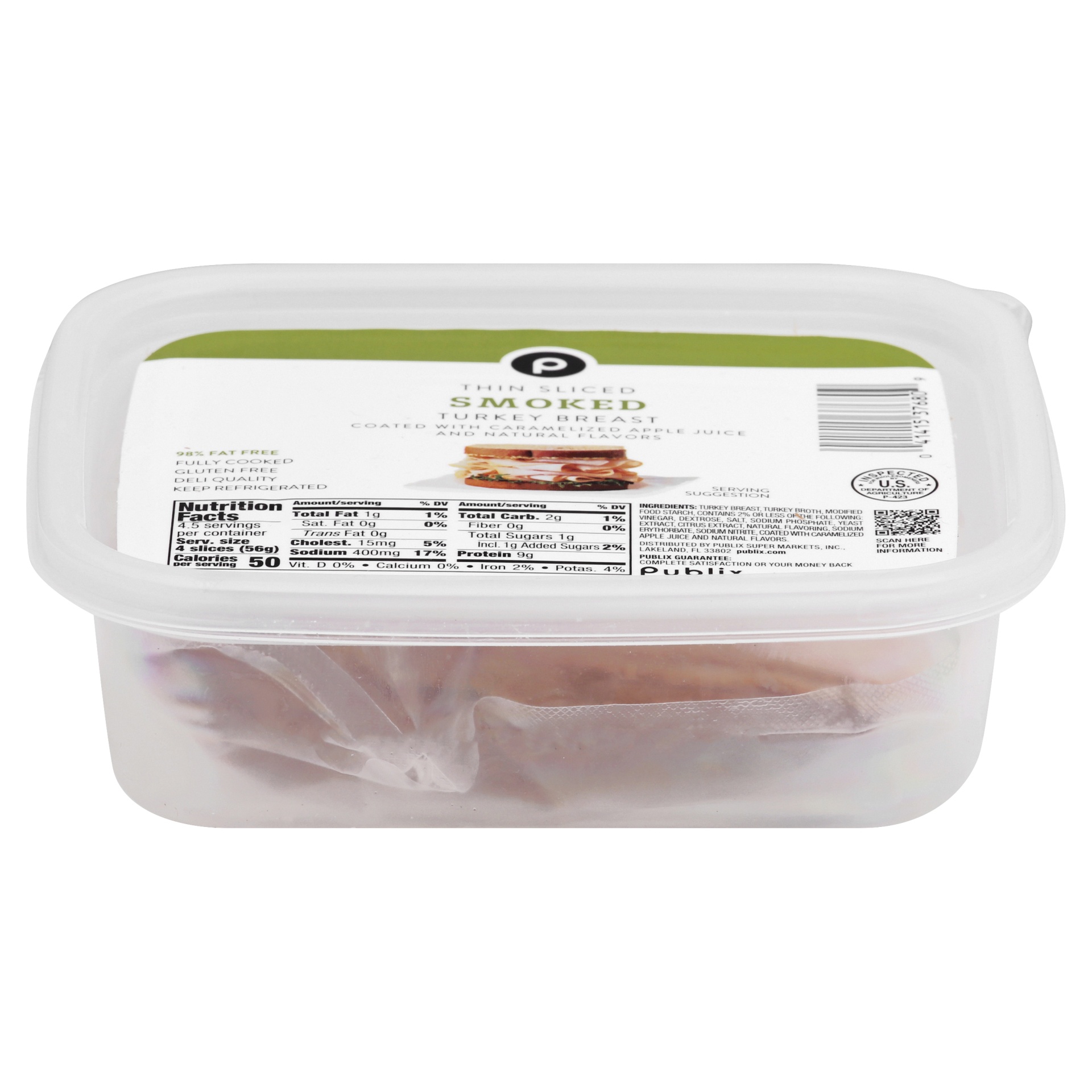 Publix Smoked Thin Sliced Turkey Breast, Savory sandwich starter. Publix Smoked Turkey Breast is sliced thin and full of smoky flavor. Low in fat and high in protein, it's a lunchbox favorite.