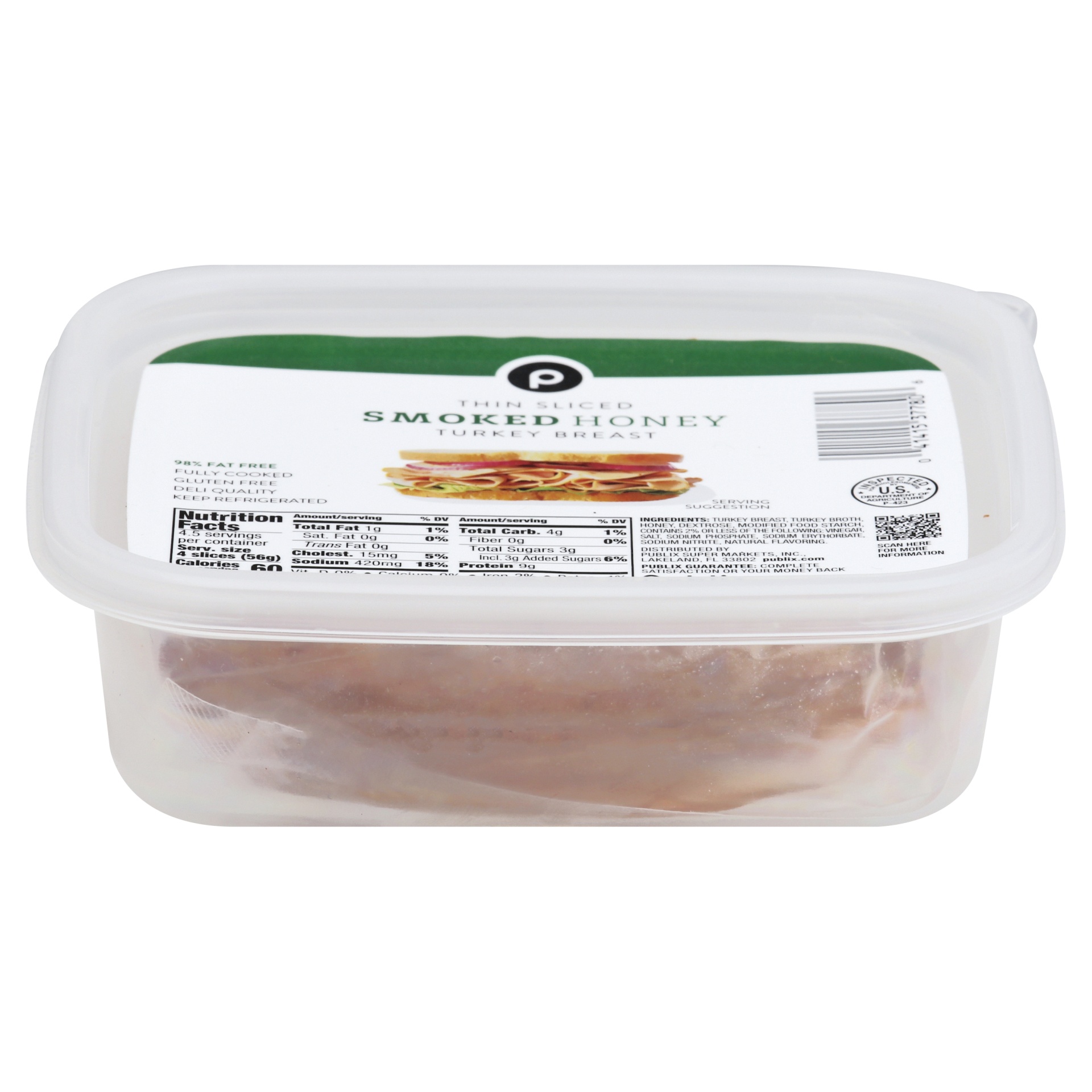 Publix Thin Sliced Smoked Honey Turkey Breast, Sweet and smoky. Publix Thin Sliced Smoked Honey Turkey Breast is deli-fresh and full of flavor. The hint of honey sweetness pairs perfectly with the sav…