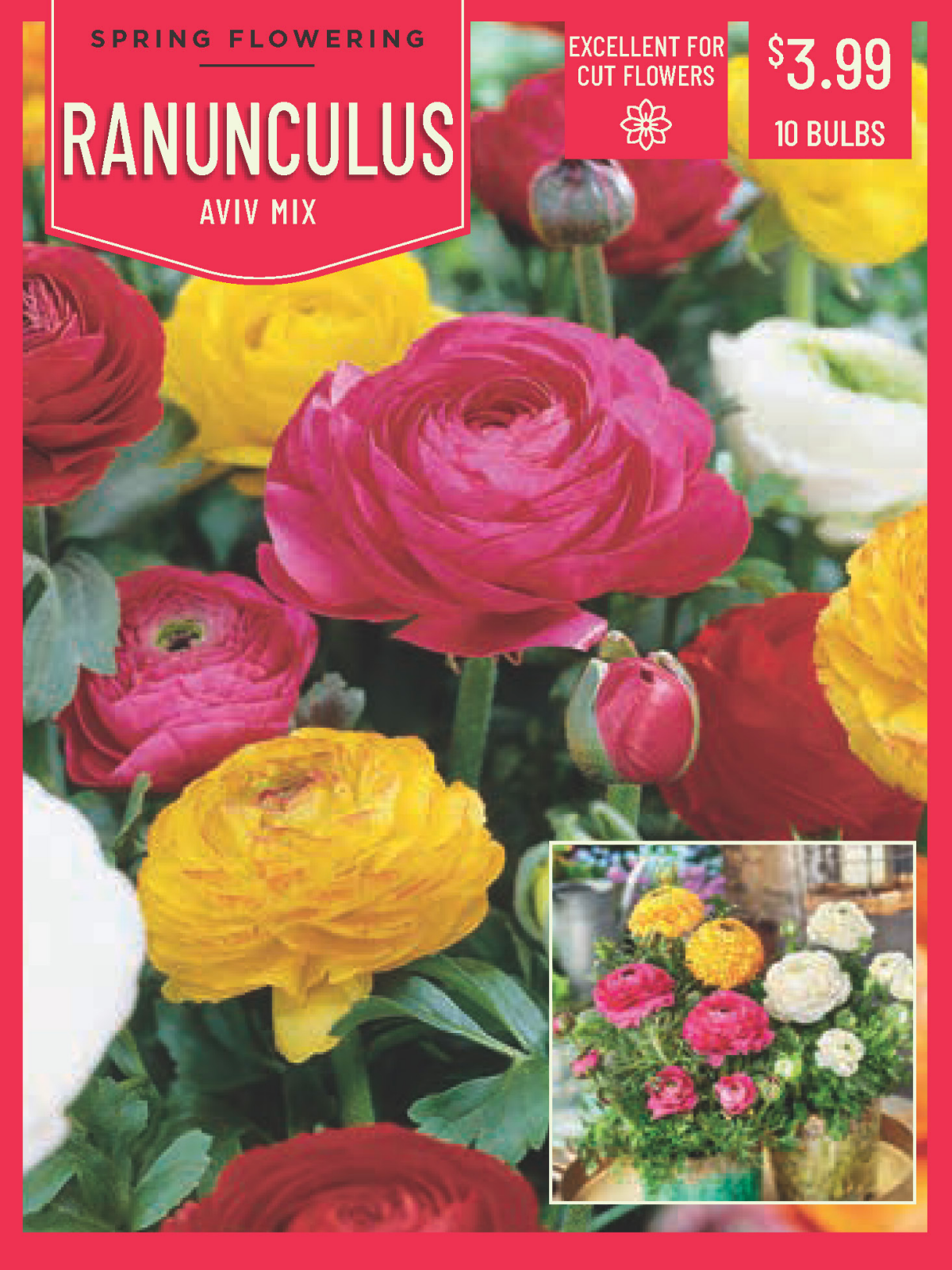 Ranunculus 'Aviv Mix' is a stunning blend of Persian Buttercup flowers known for their lush, rose-like petals in a mix of bold, vibrant colors. These flowers are perfect for cutting gardens, as they h…