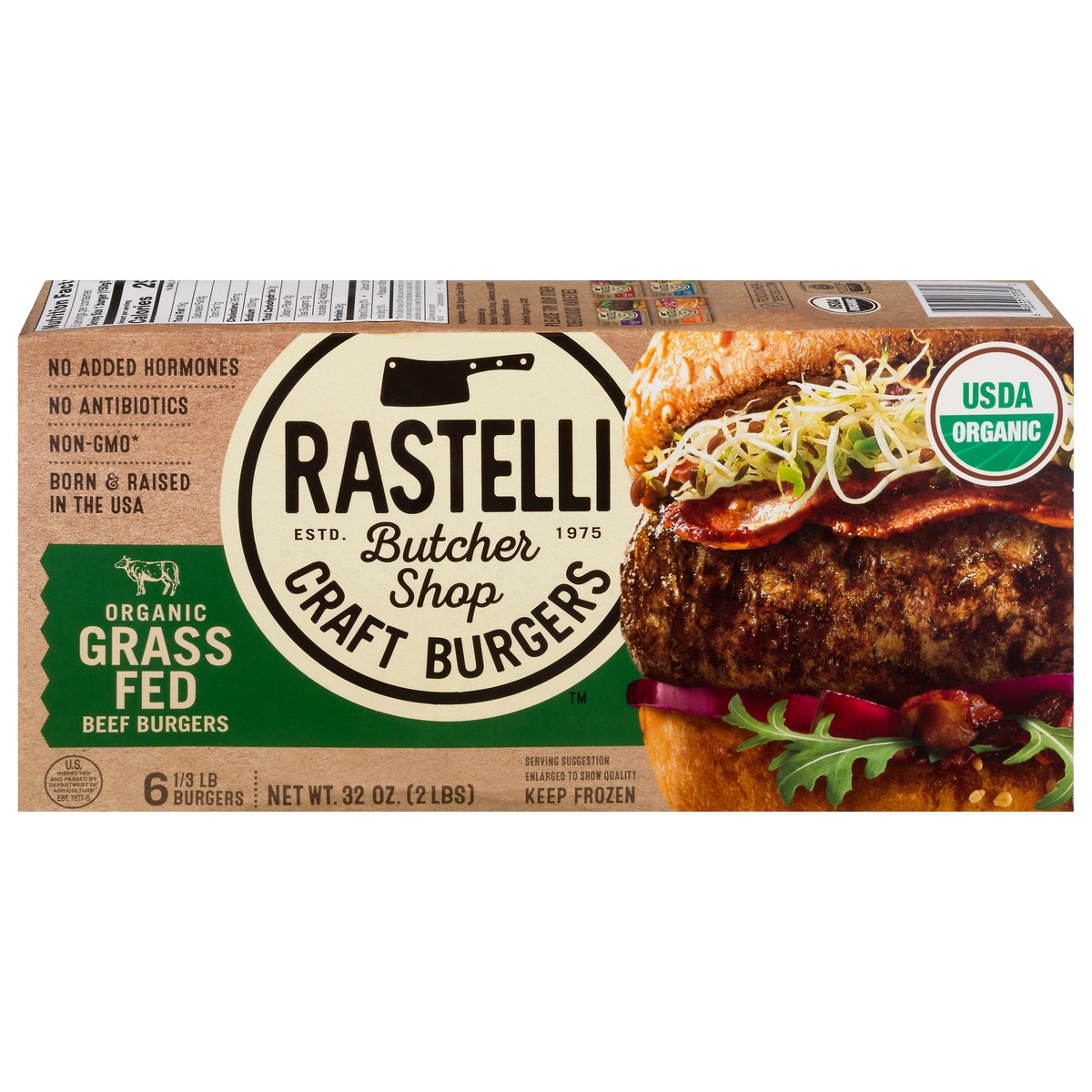 Organic grass fed beef burgers. USDA Organic. Certified Organic by CCOF. No added hormones. No antibiotics. Non-GMO. Estd 1975. Our Story: We are proud to introduce Rastelli Butcher Shop Craft Burgers…