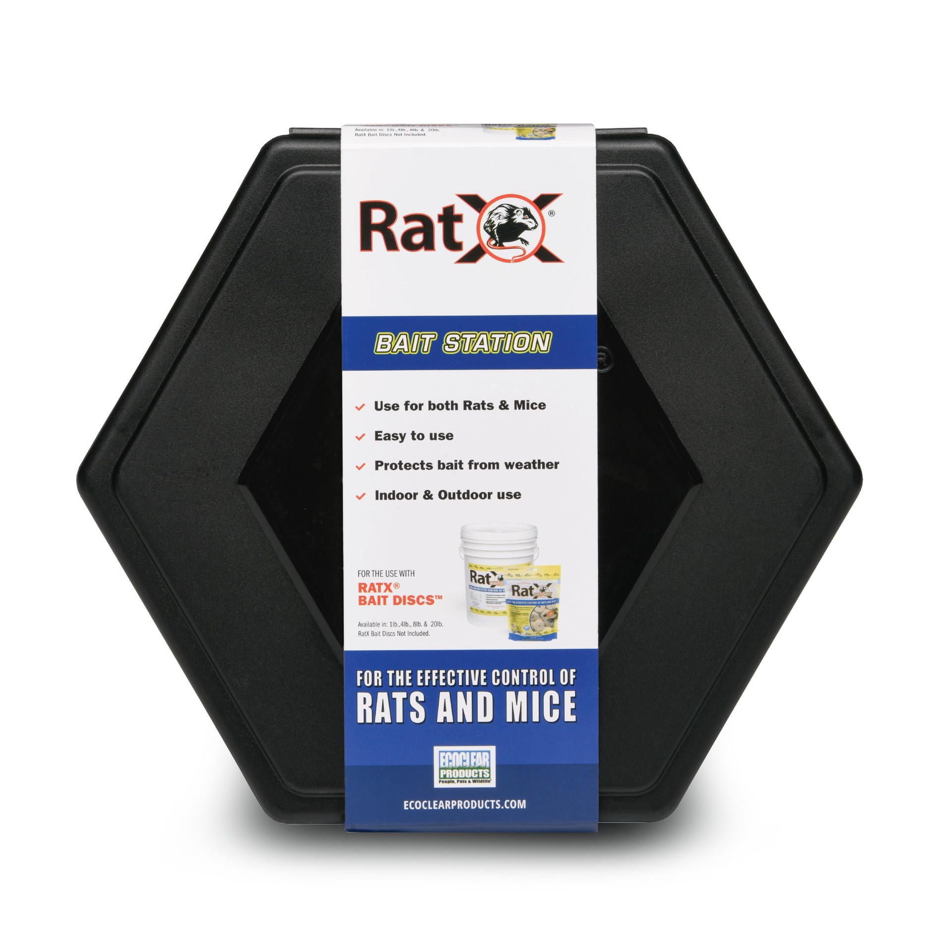 Weatherproof black plastic bait station made in the USA. Holds (6) RatX bait discs or use with bait pellets (both sold separately). Compatible with most competitive brands. Protects bait from the elem…