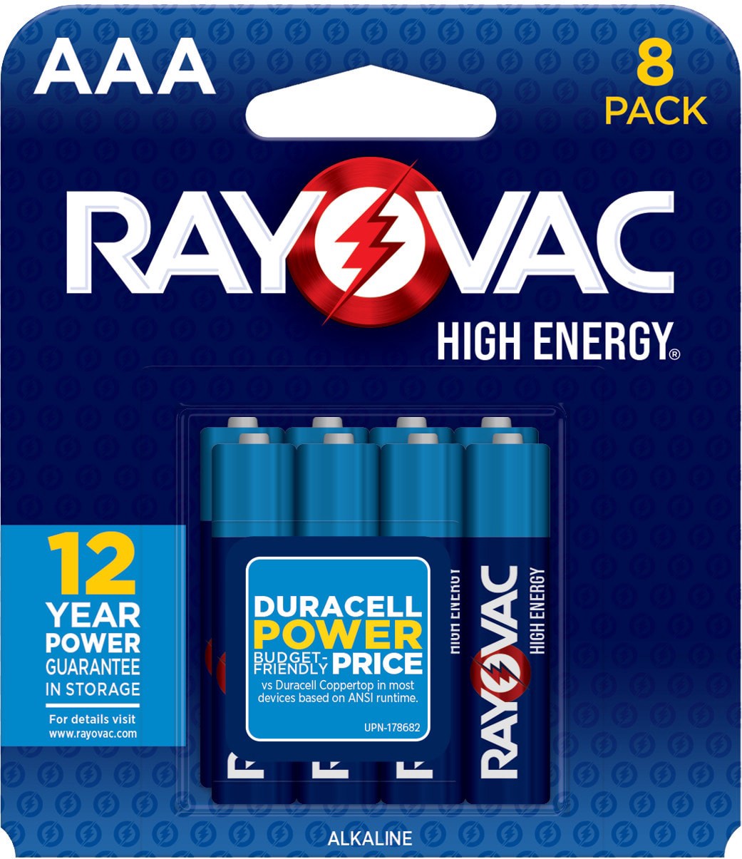 8 pack of Rayovac High Energy alkaline AAA batteries. Long lasting guaranteed. Designed to prevent damaging leaks and tested twice prior to shipment to ensure reliability. Ideal for high use devices i…