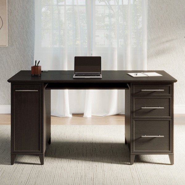 Realspace® Koru 60""W Straight Computer Desk With Integrated Power & Charging, Espresso Oak, BIFMA Compliant