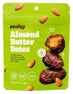 "Almond butter-filled medjool dates, comes in a pouch with 3 filled dates. Gluten-free, vegan, no added sugars, and made with only 3 real ingredients!"