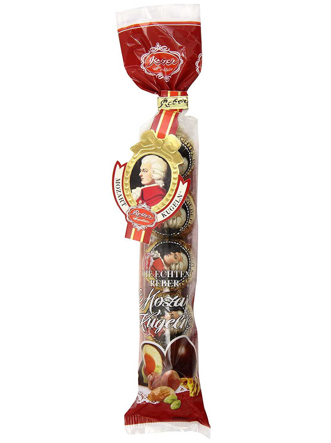 This decorative confectionery bag contains 5 Constanze Mozart-Kugeln filled with finest gourmet pistachio marzipan made from fresh, green pistachios, almonds, hazelnut nougat, and covered with two lay…