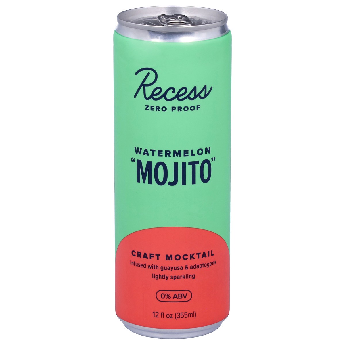 Recess Zero Proof watermelon “mojito” is a craft mocktail infused with *uplifting guayusa & balancing adaptogens to taste and feel like a refreshing mojito with its juicy watermelon and spearmint fini…