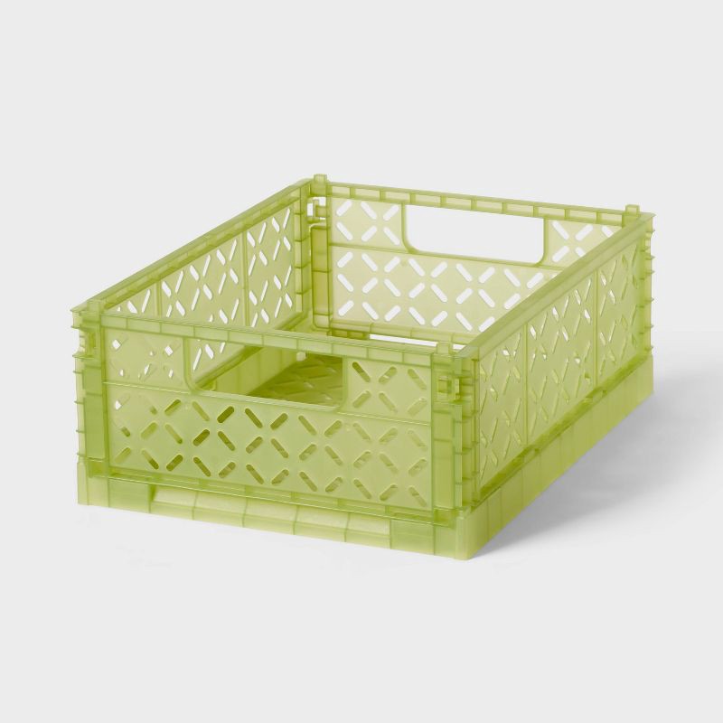 Tidy up your space in sleek style with this Medium Rectangular Plastic Foldable Crate from Brightroom™. This medium rectangular crate in a green hue features an allover cut-out cross pattern for textu…