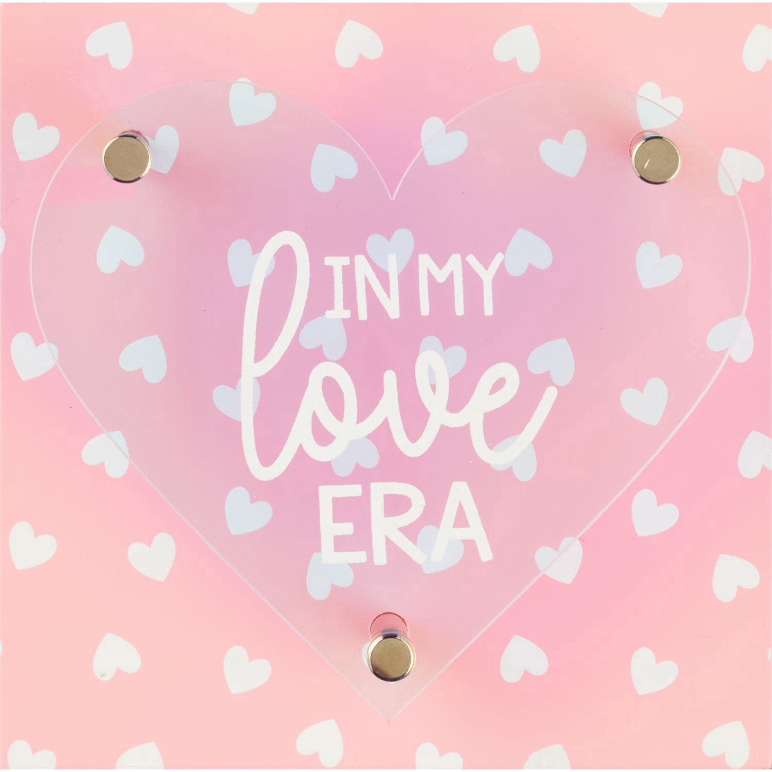 The table's set for a special Valentine's Day dinner with this acrylic tabletop décor. A beautiful, multicolored sunrise heart floats under a field of smaller hearts, with the message 'In My Love Era…