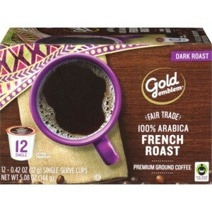 Fair Trade Certified. Dark roast. Single-serve cups compatible with 2.0 brewing systems. 100% Arabica beans. French Roast blend. Gold Emblem Fair Trade Certified French Roast coffee, with its notes of…